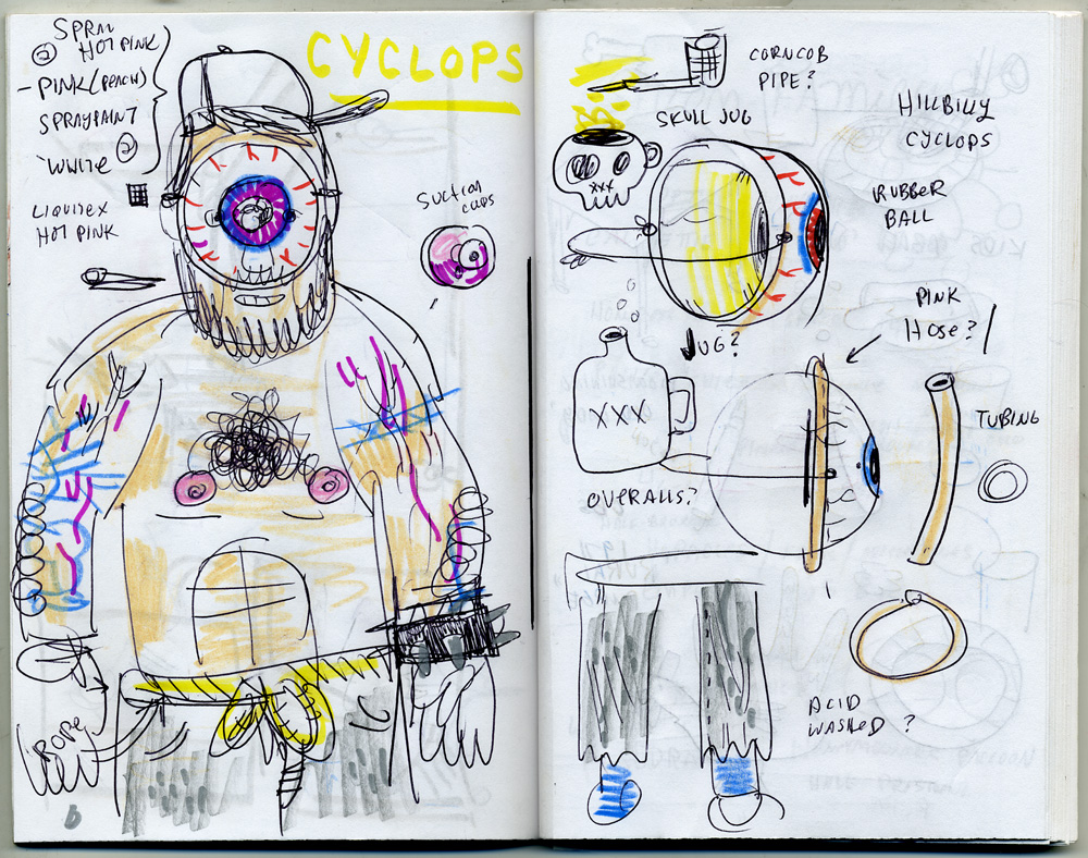 Illustrations, Comics, Diagrams, Paintings, Maps and Secret Codes, affixed to the hidden plywood wall of a backyard fort with masking tape.